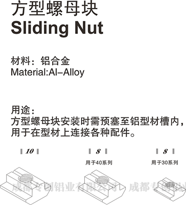 方型螺母塊安裝時需預塞至鋁型材槽內,用于在型材上連接各種配件。