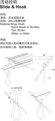 將此件插入型材槽內可來回滑動、掛勾各種工具、線材等物體。